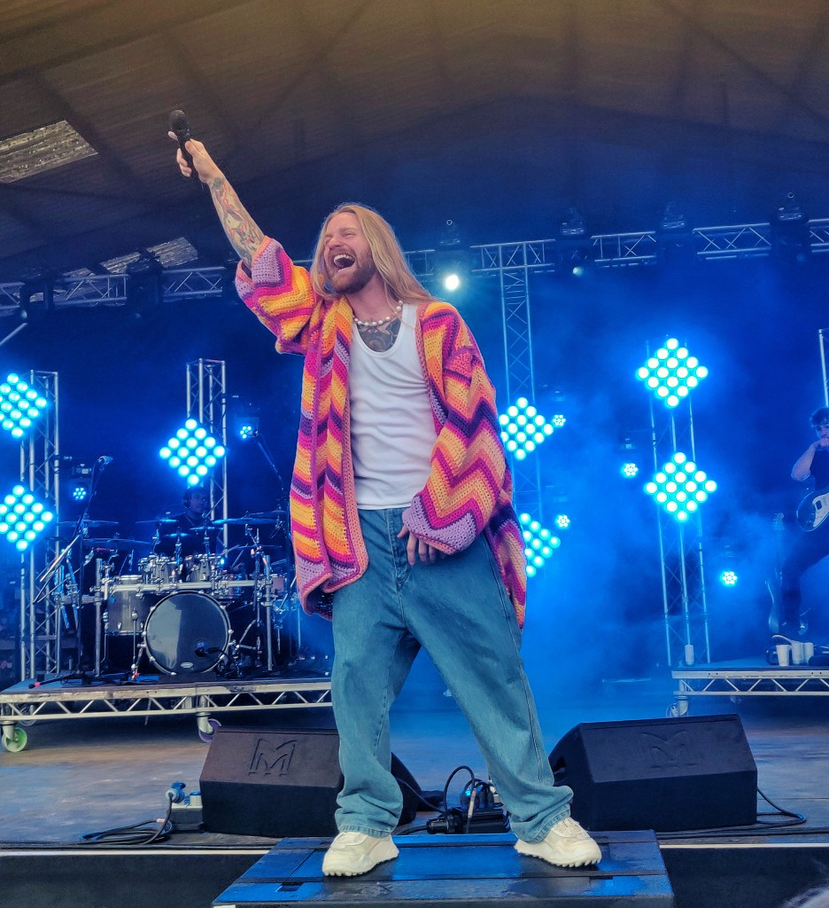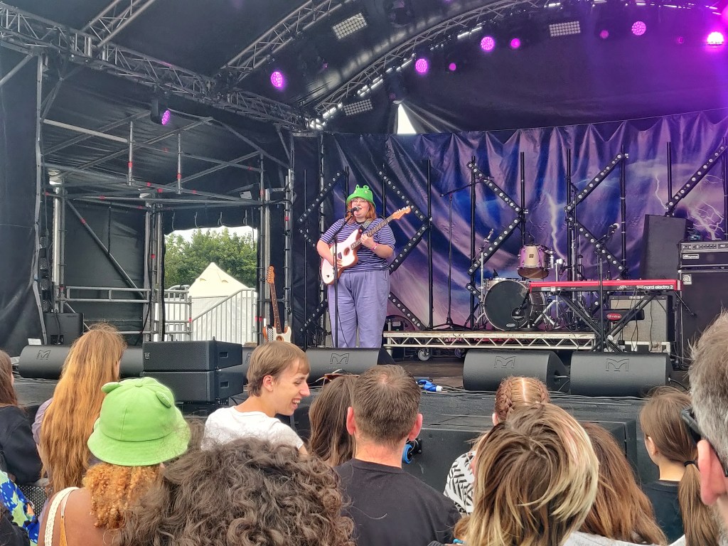 Still running on adrenaline the next morning, my Sunday began with the frog-hatted singer/songwriter Corook on the outdoor stage. Even though it was her first ever UK show, it was clear there were plenty of fans in the crowd, and after her quirky and charming set it was easy to see why. Having missed Ber’s set last year, and having loved all the new music she’s released since then, I made sure to get a good spot to see her at the outdoor stage. Some mic trouble plagued the start of her set, but once that was resolved she owned the stage like a real pop rock powerhouse. Given her energy onstage, I don’t know how she had enough gas left in the tank to run over to the main stage for this year’s Farm Band. Joining Flyte and Billie Marten, 2023’s impromptu supergroup felt very much like a songwriter’s circle kind of affair. The spontaneity of it certainly makes it feel unique, but the fact all the artists were seated likely left a lot of people struggling to see. The set’s finale saw them joined by the one and only Sigrid for a cover of Neil Youngs ‘Old Man’, and let me tell you the farm band’s harmonies on that track was one of those live music moments where you feel it in your very heart and soul. Keeping the supergroup theme going, the newly formed Fizz later burst onto the main stage for their first festival performance. From eccentric outfits and clarinet solos, to sock puppets and songs about Rocket League, their madcap maximalism was just the sugar rush the day needed.