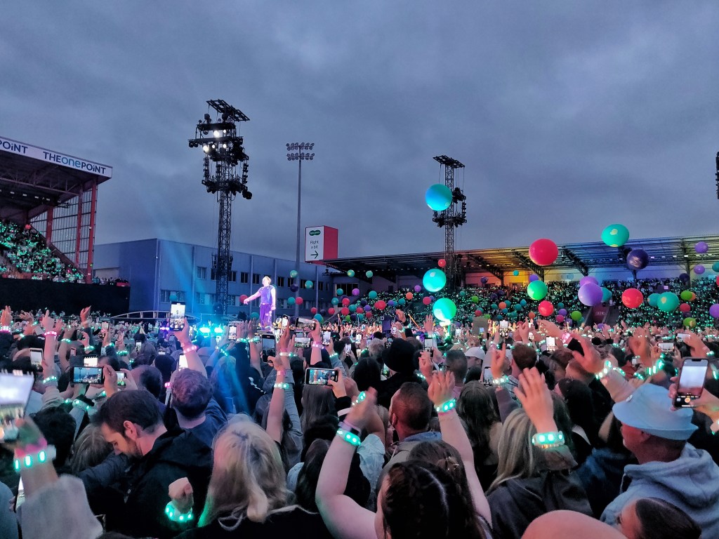 Odd as it sounds, in all my years of gigs, I’ve never been to a show with fireworks. My one wish for the evening was to tick that off my bucket list – if anyone was gonna end their show with a bang, it would be Coldplay. Lo and behold, as the band greeted the crowd and took their positions, the opening bars of ‘Higher Power’ were met with a burst of fireworks above the stage. Not only was my wish granted, but it set the tone for the evening to follow. As the beginning of the set shifted through ‘Adventure of a Lifetime’ into ‘Paradise’ and beyond, fireworks sparked overhead, plumes of confetti drifted in the breeze, giant inflatable balls bounced around the stadium, extra hidden screens and mirrorballs rose into view above the stage, and the wristbands illuminated the crowd like some kaleidoscopic galaxy. There was no saving it all for the big finale, the show pulled out all the stops at every opportunity.