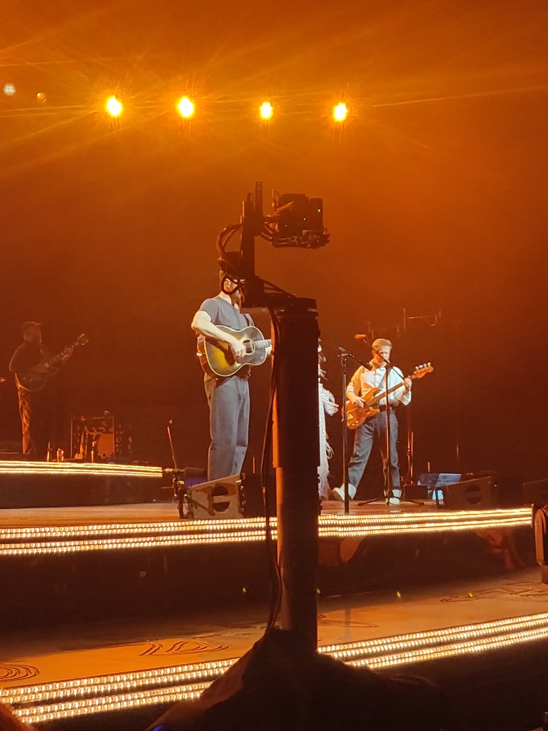 Trudging my way to – and queueing outside of – the arena in the pouring rain certainly dampened my spirits a little, and dampened my coat considerably more. All the more reason to get a good spot at the front early doors, so the heat of the crowd could warm me back up again. The opening act also had a hand in warming up the crowd, by whisking us all away out West. Just in case the evening didn’t have enough banjos scheduled already, country artist Sierra Ferrell and her band had us covered. The band took to the stage dressed like The Good Ole Boys from The Blues Brothers, with their matching shirts and cowboy hats, while Sierra herself seemed to be getting into the festive spirit with her sparkly dress and angel wings. I have to say her set grabbed my attention more than I expected it to. ‘Cheatham County’ had a dark bluesy feel, ‘American Dreaming’ saw her bring Marcus Mumford on stage to sing backing vocals, while the spooky stomp of ‘Fox Hunt’ ended her set on a high, with a heavy jam session in the outro. While a lot of country music fails to translate well outside of the states, Sierra managed to cut through.