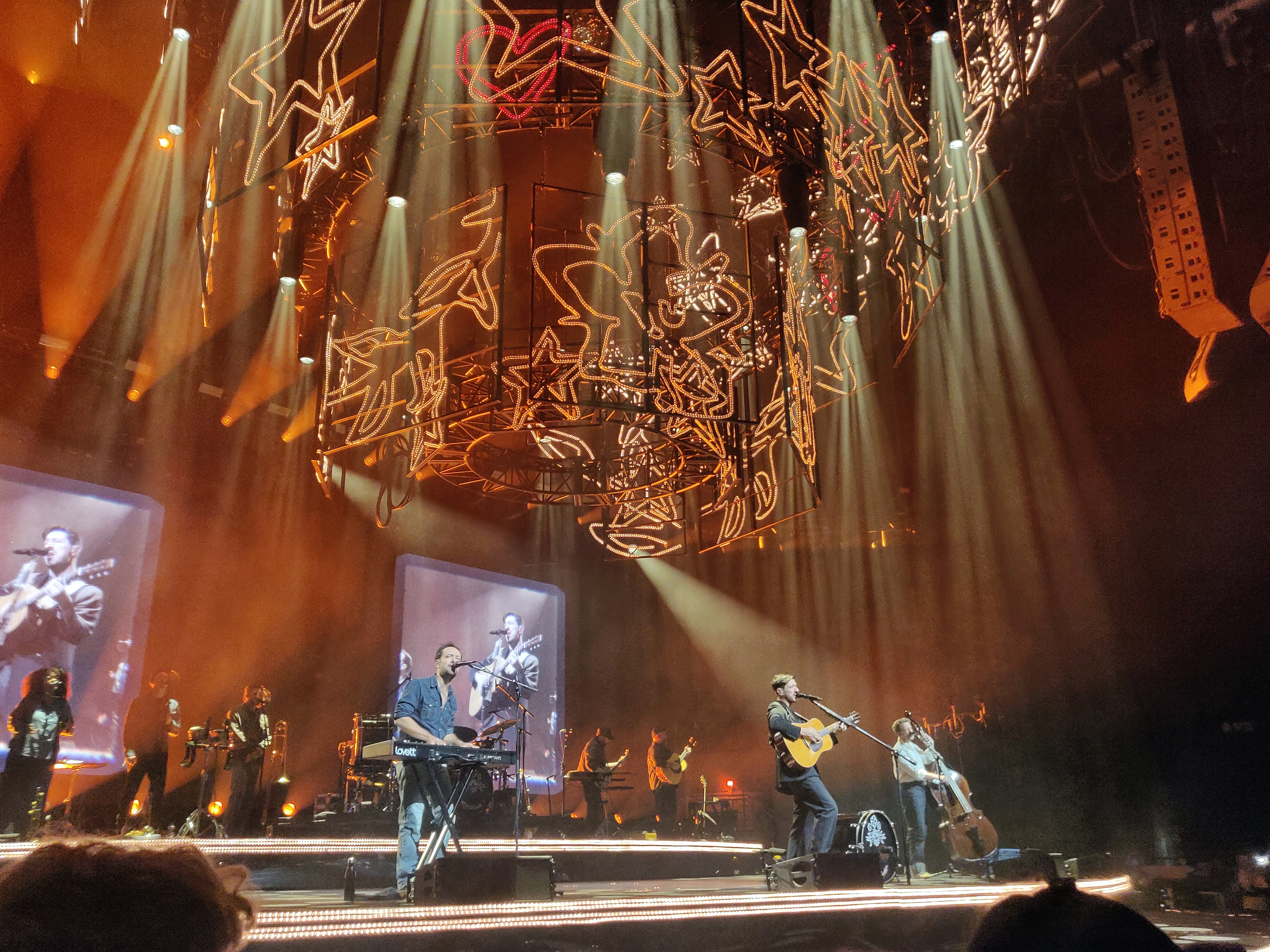 I think warmth would be how I’d best describe the atmosphere of the evening. All the best parts of the show just radiated it. The endearing lighting rig that resembled a small town’s Christmas light switch-on, periodically descending from the rafters to bathe the stage in its golden glow. The way the band had everyone singing along when they took to the B stage for a cover of Simon & Garfunkel’s ‘The Boxer’. How the lads gathered round a single mic for a stripped back rendition of ‘Timshel’, or how Marcus sprinted right to the back wall of the nosebleeds during ‘Ditmas’, high fiving fans as he went. In an ideal world, moments like these would have been my lasting memory of the night.